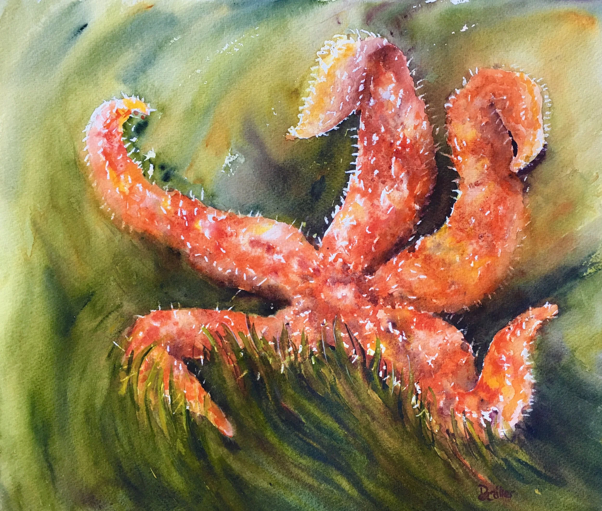 Yesterday I found this one and it is thriving. I couldn't help but paint it. The arms were strong and full of color as it waited for the incoming tide. It is easy to forget how fragile the balance in nature is. As the ocean temperature changes--in recent years the pacific coastal waters and warmed--even the small creatures are impacted. I am very happy to see our sea star friends making a comeback.